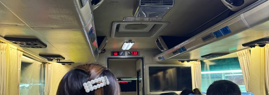 そんなわけで自由にトイレに行けないバスに長時間乗るのは気が重かった。だがもう、おしっこを漏らしてもいいではないか、むしろ漏らして足跡を(象徴的にも実質的にも)残すぐらいの気持ちで行こうと、覚悟を決めて乗り込んだ。そして、バスにはトイレもついていた。