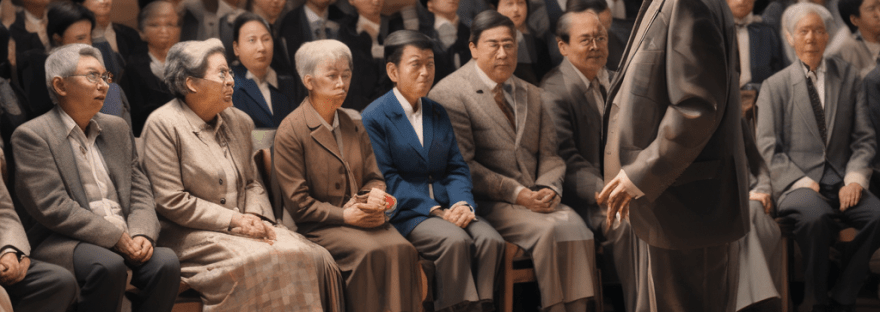 老人たちが会議室に集まっている。ひとりの老人が立ち上がり、みんなの前でグラグラと揺れ、がくりと膝をつき、そのまま尻餅をつき、横になる。
