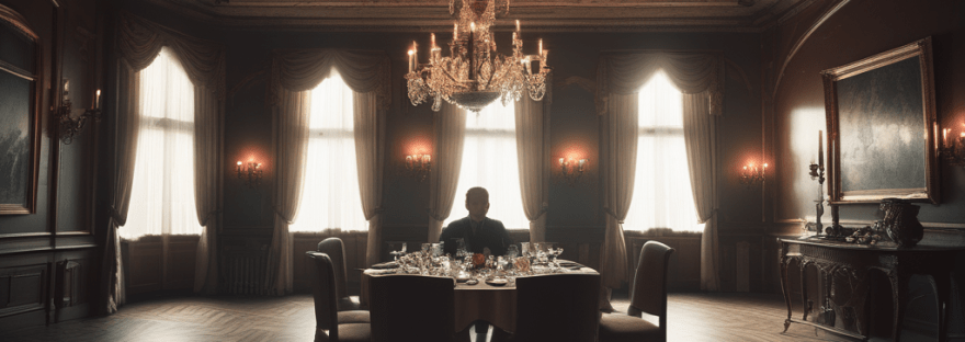 まるで西洋の古城のような壮麗な室内が描かれている。食卓がしつらえられていて、豪華な料理が並んでいる。着座しているのは、この屋敷の主人らしき威厳ある男だ。その顔はまるで冷酷な軍人のようだ。彼は鋭い目つきで、前に座る若者を見つめている。