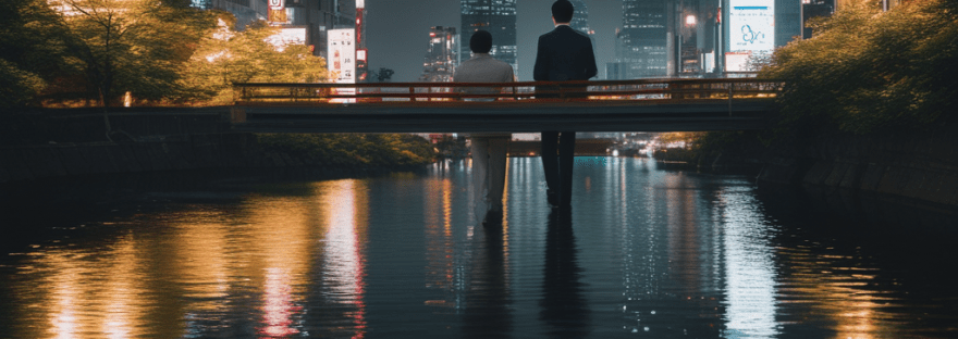 夕暮れどきの東京で、二人の男が川面を見つめていた。二人ともシワだらけのスーツ姿で、疲労が滲んでいる。その顔には深い失望が刻み込まれていた。