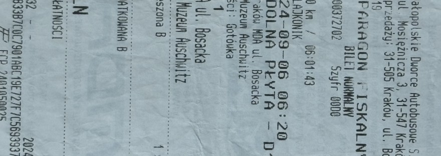 ただし、もう深夜の1時だったので、バスのチケットの予約はできなかった。なので、私は翌朝の午前5時過ぎにホテル(というか貸し部屋)を出て、クラクフ駅の隣にあるバスターミナルに行った。掲示板を見ると、6時20分に「Oświęcim(オシフィエンチム:アウシュヴィッツのポーランド語名)」行きのバスがあった。チケット(22ズウォティ、千円ぐらい)を買い、地下のバス停に行った。