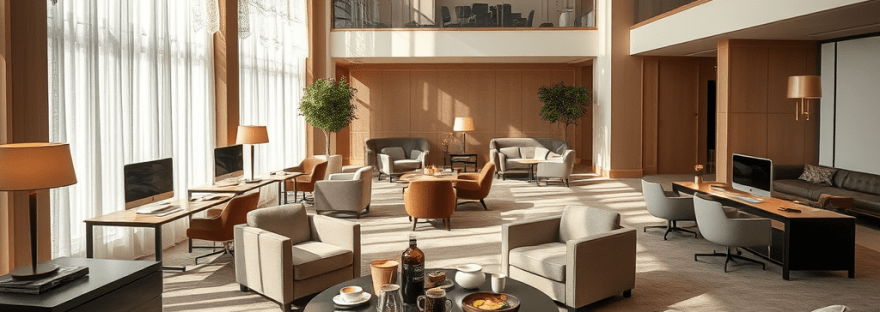 エレベーターから降りると、目の前にはホテルのラウンジのような空間が広がっていた。白いレースのかかった窓からは穏やかな光が差し込み、ソファに座る人々を包み込んでいた。そこここにデスクが置かれ、人々はその上の iMac の画面を見つめている。ラウンジの中央には円形のテーブルがあり、その上にはコーヒーサーバー、水差し、ジュースの入った大きな瓶、スナックやお菓子が並べられていた。