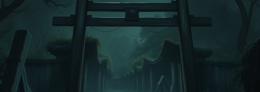 その神社の入り口には血のように赤い鳥居があり、私はくぐり抜け、半ば崩れた石段を上がっていった。そして、その先には古びた手洗い場があった。そこの水はひどく汚れていた。私はさらに前進し、ついに神社の正面に立った。情報によればここがもっとも恐ろしい場所だという。