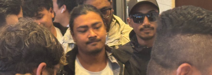 だが、4時半ごろ、動きがあった。エレベーターが開いて、スタッフが乗り込もうとしたのだ。いや、KUMA SAGAR だ。クマ・サガルとバンドメンバーたちがエレベーターに乗ろうとしているのだ。誰もが写真を撮り始めたので、私も携帯をかざした。
