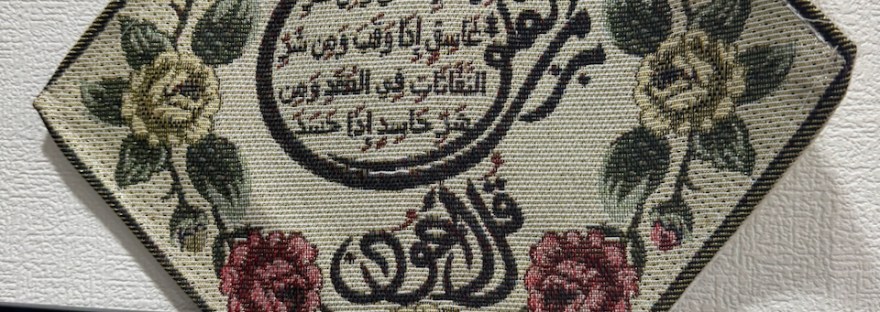 会計するためにレジのところに行ったら、壁に奇妙なものが貼られているのに気がついた。正方形のタペストリーで、アラビア文字が織り込まれている。私はここでメニューに豚肉がいっさいなかったことに気がついた。会計を済ました私が、店の主人にタペストリーの写真を撮っていいか手振りで尋ねると、どうぞというようすだった。