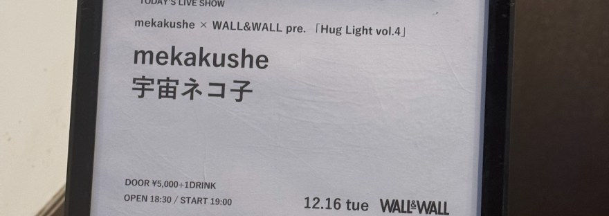 宇宙ネコ子が mekakushe とライブをするというので行ってみた。タイトルは「mekakushe × WALL&WALL pre. Hug Light vol.4」。会場は表参道のWALL&WALL。