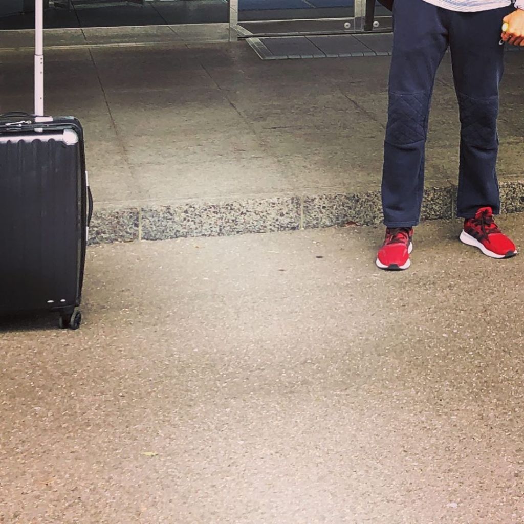 私たちは入管を出た。玄関前で記念撮影。Kさんは、満面の笑みで、突き立てた親指を下向きにした。