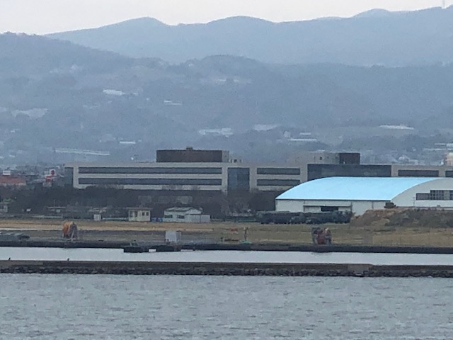 橋の脇に自衛隊の航空基地があり、私たちが橋を渡り始めると、すぐ近くからヘリコプターが飛び立った。Kさんは「毎日うるさいんだよ」と目で追う。