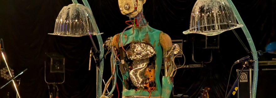 さて、ライブの間じゅう、ステージ上方で楽しげに飲食している男女の姿は、このロボットの記憶の一部だとのこと。ライブが終わり、ほとんどライブ第2部といってもいいような厚みのあるアンコールののち、2人の俳優が紹介された。男性がデッカチャンだということがわかった(ニガミの MV にも出演している)。
